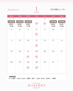 いつもマリエーヌ洋菓子店をご利用いただきありがとうございます。12/29~12/31、1/3,4は短縮営業となります。1/1,2は休業とさせていただきます。
